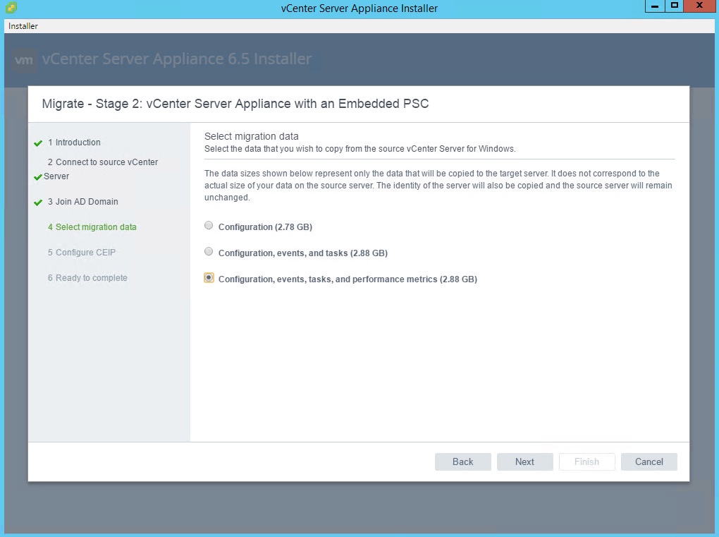- In the “Select migration data” window, select the data to be upgraded (Configuration, Configuration/Events/Tasks or Configuration/Events/Tasks/Performance Metrics) and press “Next”.