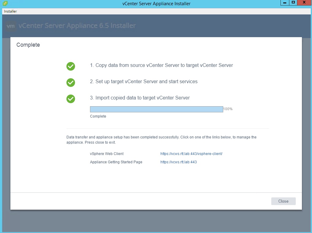 - When the message “Complete” appears with the three green ticks for each stage, record the vSphere Web Client and Appliance Getting Started Page hyperlinks and then press “Close”.