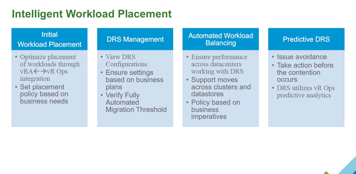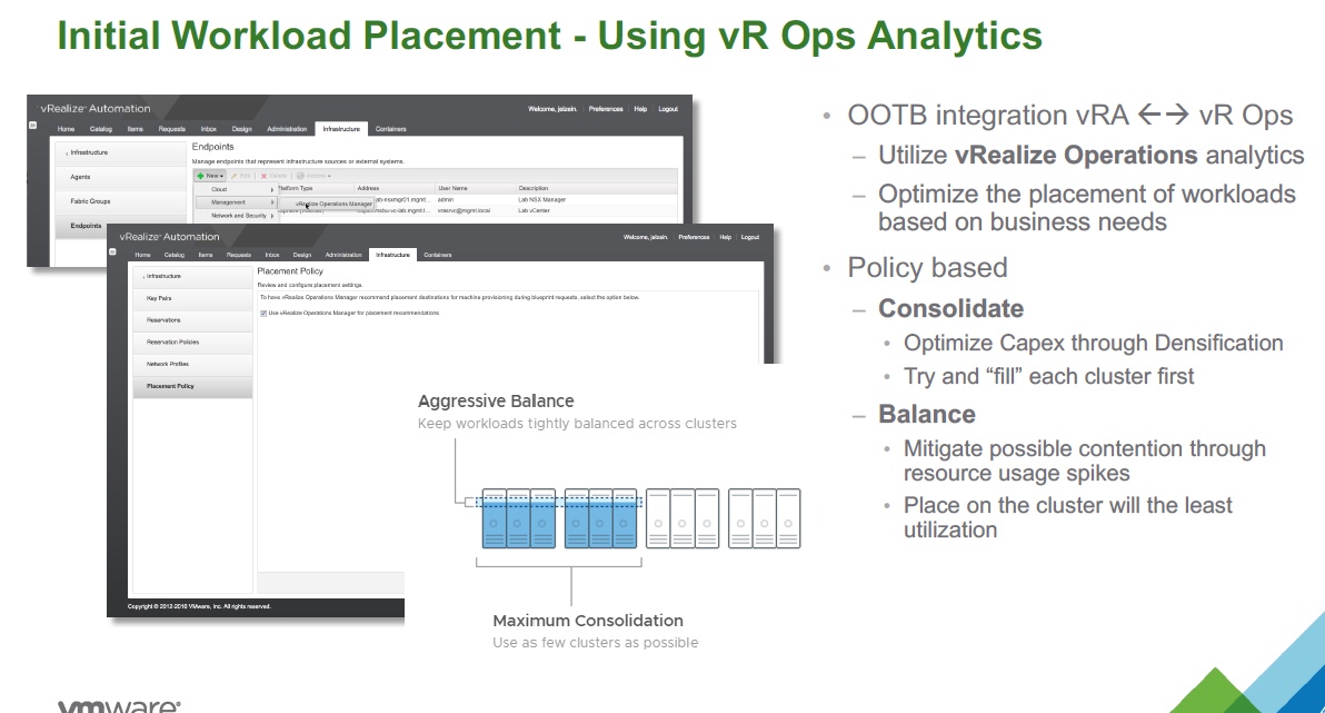 - Proper Initial Placement – Utilize Operations analytics to optimize placement of workloads through vRA