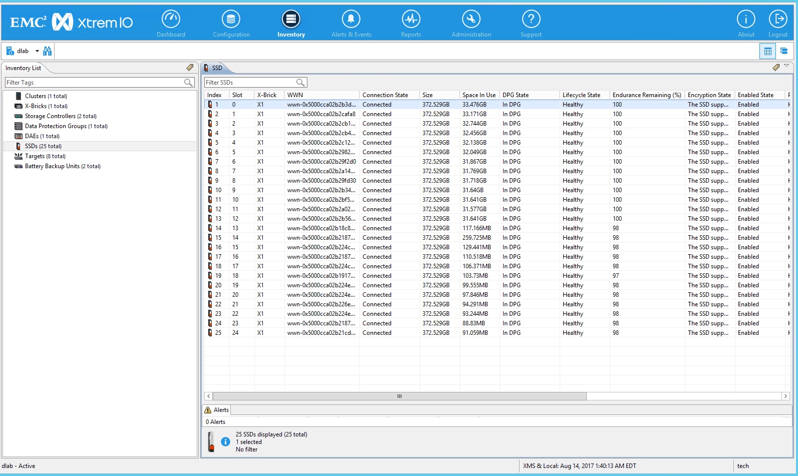 - Select the Inventory pane of the XMS UI, select the Table View and then select the SSD object. All 25 SSDs should have a “DPG State” of “In DPG” and a “Lifecycle State” of “Healthy”.