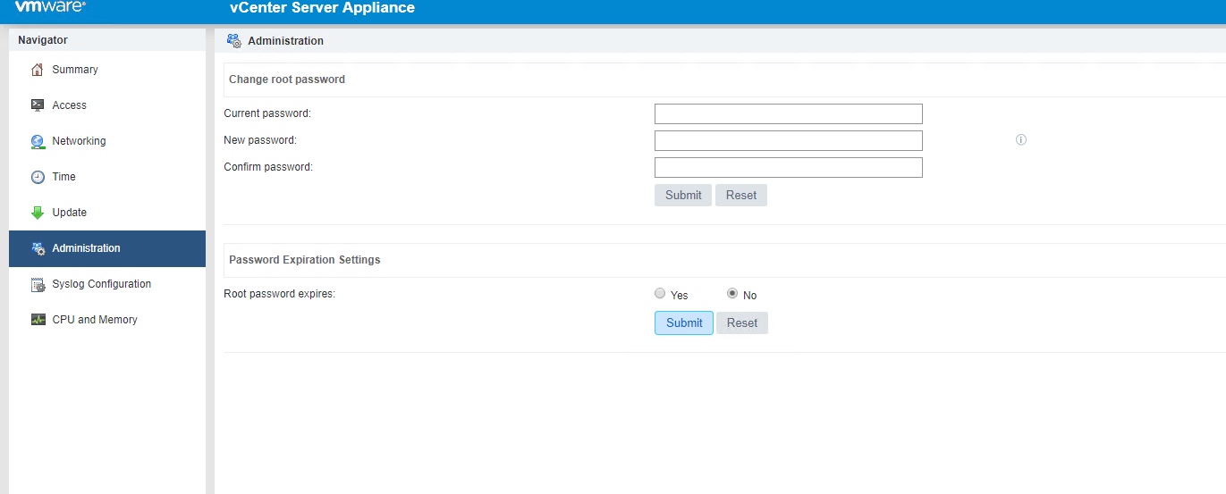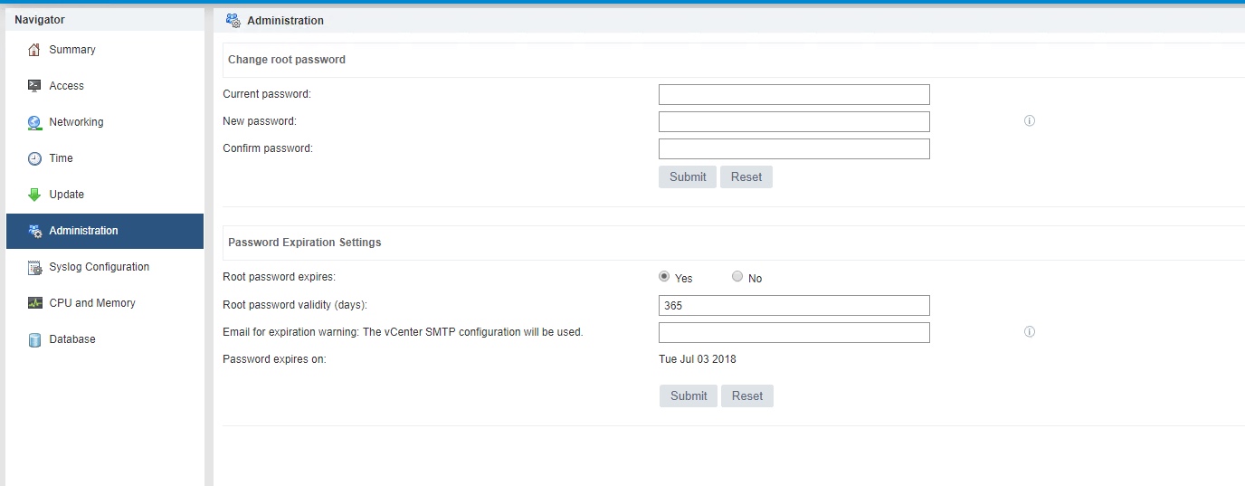 - Set the “Root Password Expires” to “No” and press Submit.