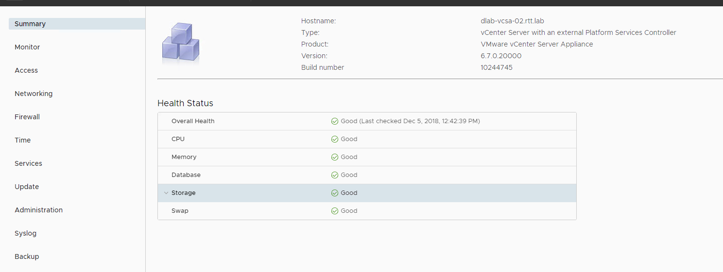 - Verify the vCenter Server Appliance VAMI Health Status for Storage is “Good”.