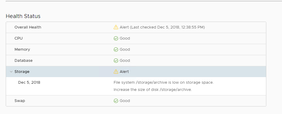 - vCenter Server Appliance VAMI Health Status reports an Alert for Storage: “File system /storage/archive is low on storage space. Increase the size of the disk /storage/archive.” Access this page from Summary, Health Status.