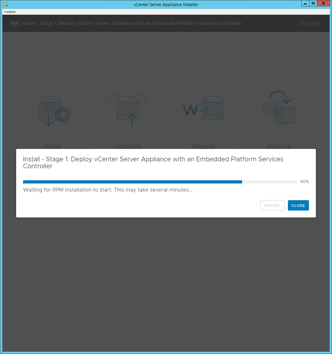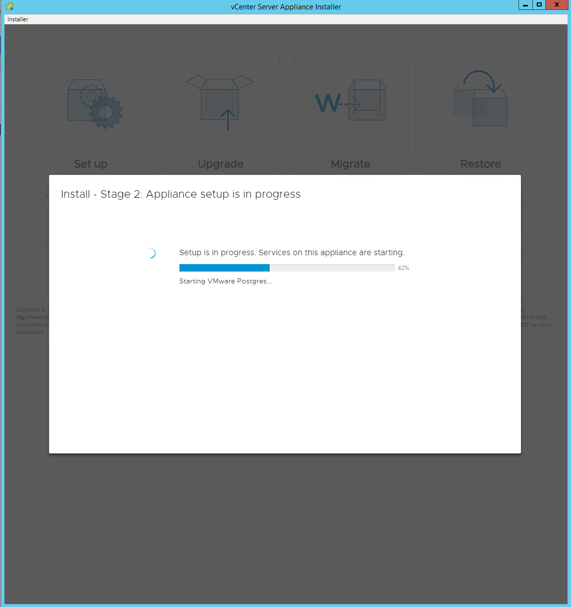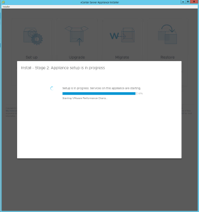 - The process of configuring the vCenter Server Appliance will begin. Be patient, this takes 30 minutes or more.