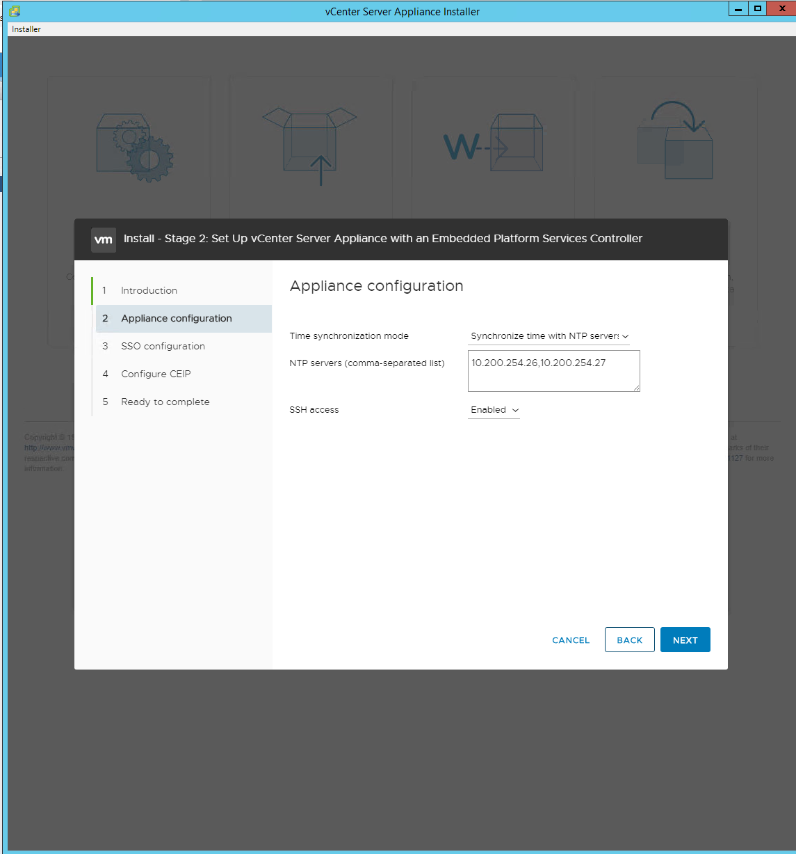 - In the “Appliance configuration” window, set the Time sychronization mode to NTP, enter the NTP servers, enable SSH (required for vCenter HA) and press “Next”.