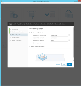 - In the “SSO configuration” window, set the SSO domain name, enter the administrator Password and press “Next”.