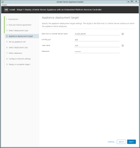 - In the “Appliance deployment target” window, enter the FQDN or IP Address of the ESXi host or vCenter Server, the HTTPS port, the User credentials and press “Next”.