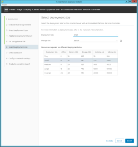 - In the “Select deployment size” window, select “Tiny, Small, Medium, Large or X-Large”, the Storage size (Default, Large or X-Large) and press “Next”.