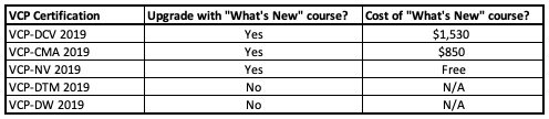 The table below shows that VCP-NV 2019 is the only one to provide a free upgrade with the online “What’s New” course. VCP-DCV 2019 and VCP-CMA 2019 require a hefty fee (might as well read the free documentation and spend $250 to take the new exam instead) and the EUC tracks do not support it, you have to sit the latest exam – no bueno!